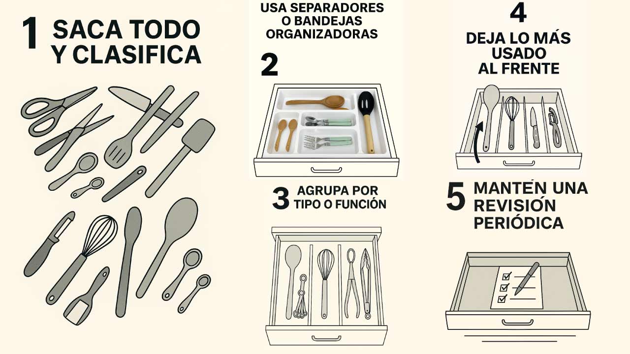 La cocina es uno de los espacios más usados del hogar, y muchas veces, sin darnos cuenta, convertimos los cajones en una especie de “cajón desastre” donde va todo lo que no tiene lugar. Utensilios que usamos a diario terminan mezclados con otros que usamos muy de vez en cuando, y eso nos obliga a revolver, sacar cosas de más o incluso comprar duplicados sin saber que ya teníamos uno guardado al fondo.