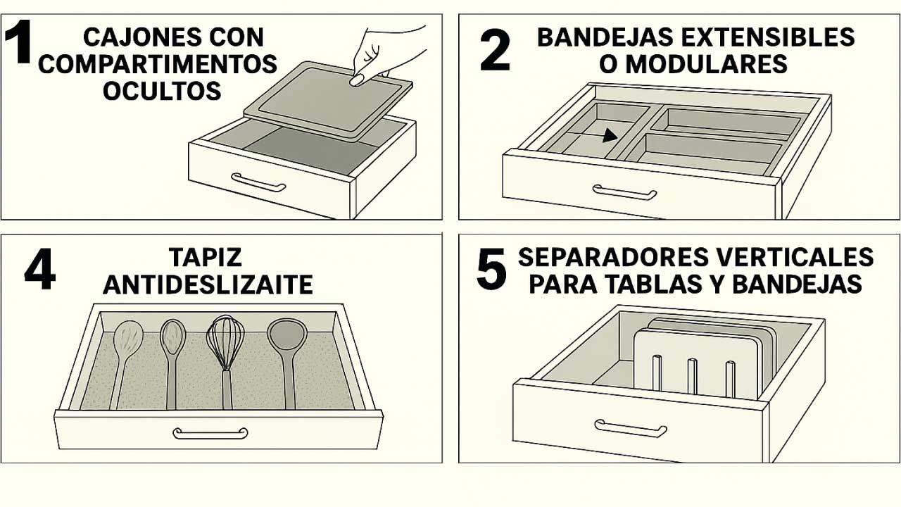 Este es el secreto para que todo tenga su lugar. Los separadores de cajones o las bandejas con compartimentos te permiten mantener cada utensilio en su sitio. Si hay algo que merece inversión en la cocina, son estos accesorios.