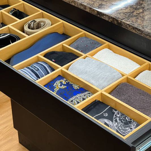 - Separadores de cajones a medida: Perfectos para clasificar ropa interior, accesorios y objetos pequeños, manteniendo el orden en cada cajón.