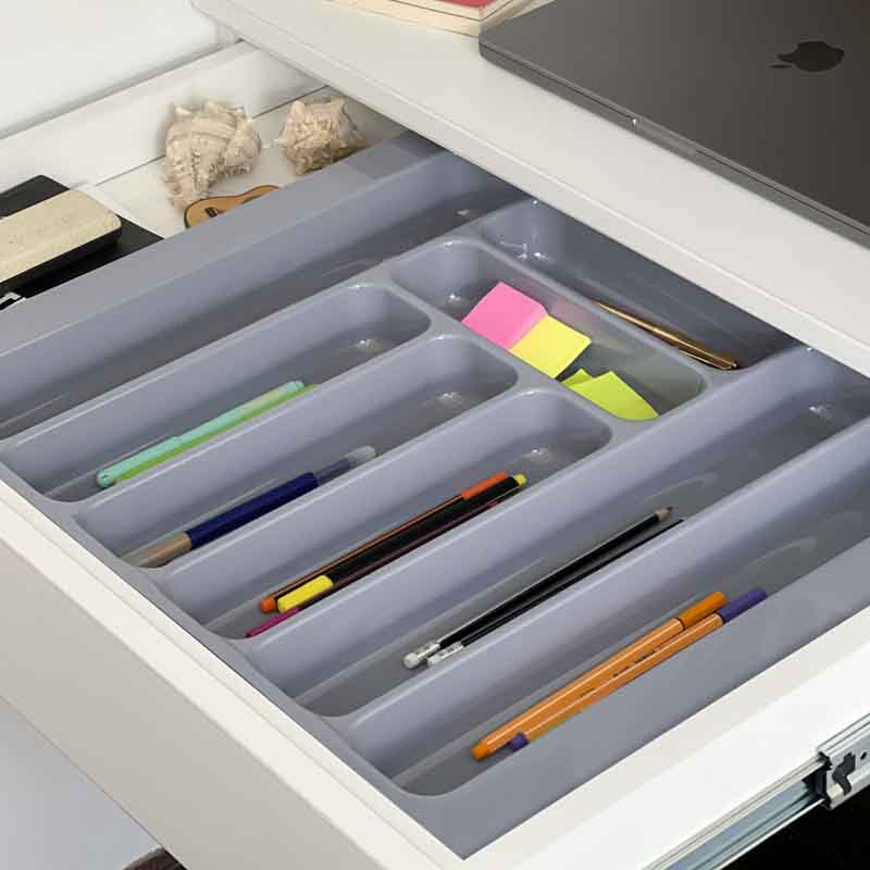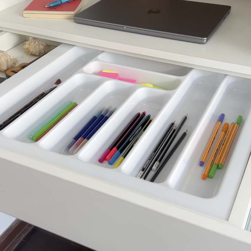 • Otros espacios: Úsalo también en tu oficina para organizar lápices, lapiceros, plumones, borradores, reglas pequeñas, maquillaje o artículos del baño.
